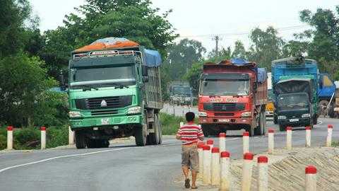 | Đoàn xe "hổ vồ" chở quá tải cung cấp vật liệu cho công trình mở rộng quốc lộ 1 đoạn huyện Phong Điền (Thừa Thiên - Huế) vẫn hoạt động bất chấp lệnh cấm - Ảnh: Tuổi trẻ |