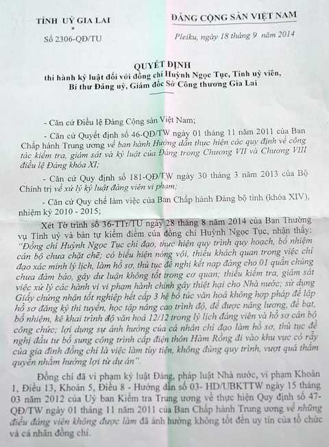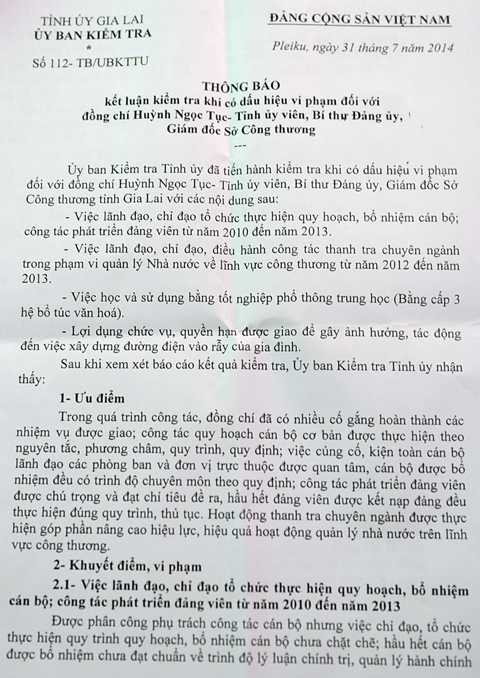 Trước đó, thông báo số 112-TB/UBKTTU của Ủy ban Kiểm tra tỉnh ủy Gia Lai kết luận, những khuyết điểm, vi phạm của ông Tục là quá rõ ràng.