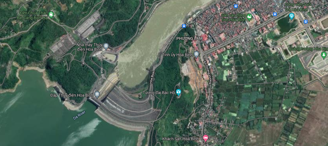 Ảnh chụp từ Google Map cho thấy vị trí của đập thủy điện Hòa Bình, bên cạnh đồi Ông Tượng (nơi có tượng đài Bác Hồ) và các cơ quan tỉnh ủy, UBND tỉnh, các ban ngành của tỉnh Hòa Bình