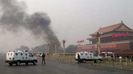 | Khói bốc lên từ chiếc xe bị cháy sau khi đâm vào Thiên An Môn |