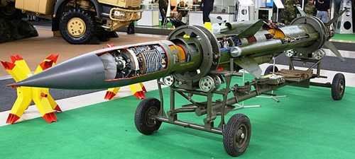 | Mô hình tên lửa 3M9 với mặt cắt hiển thị các thiết bị bên trong. |
