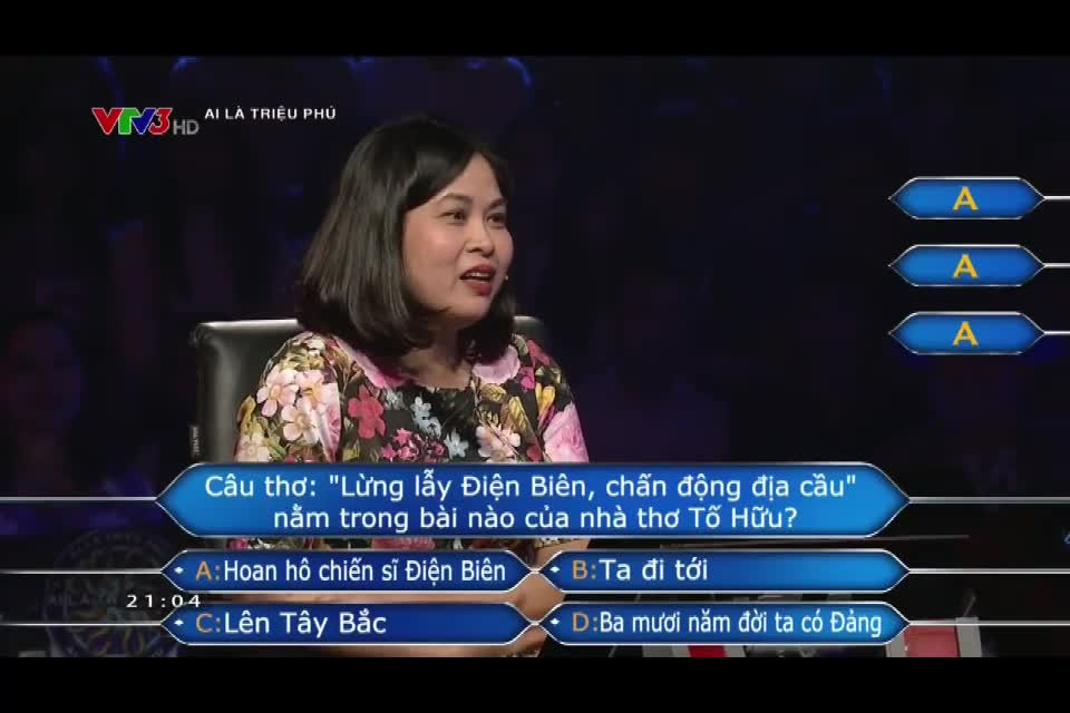 Trong chương trình "Ai là triệu phú" phát sóng tối 30/5, người chơi Dương Bích Hằng chọn sự trợ giúp từ tổ tư vấn tại chỗ, đáng tiếc đáp án được tổ tư vấn đưa ra cùng khẳng định "chắc chắn 100%" lại không chính xác, kết quả người chơi đành ngậm ngùi ra về ở câu số 6 dù còn 3 sự trợ giúp.