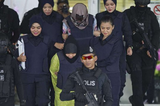 Hai người phụ nữ bị buộc tội bôi chất độc thần kinh VX lên mặt Kim tại ga sân bay ở Kuala Lumpur, ngày 13/2/2017. Họ nói tưởng rằng mình đang tham gia một chương trình truyền hình thực tế. Aisyah và Hương là hai nghi phạm duy nhất bị bắt giữ. Ngoài ra 4 nghi phạm Triều Tiên đã rời khỏi Malaysia cùng buổi sáng Kim bị giết.