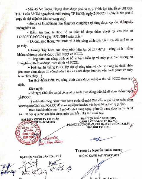 | Biên bản làm việc của Sở PCCC Hà Nội với chủ đầu tư và đại diện cư dân toà nhà số 47 Vũ Trọng Phụng. |