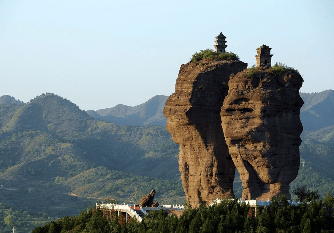 Cận cảnh hai tòa tháp đá trên đỉnh núi Song Tháp. (ảnh: Baidu)