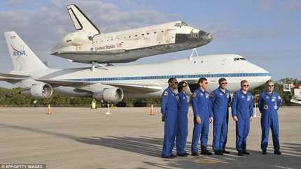 | Tàu con thoi Discovery trên lưng Boeing 747 cải tiến của NASA. |