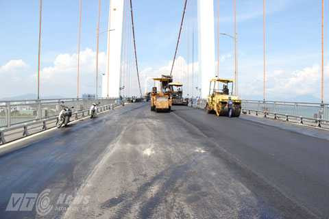 Như vậy, trễ 2 ngày so với thời gian gia hạn, ngày 9/8, những vệt nhựa thảm mặt cầu Thuận Phước cuối cùng đã được thi công.