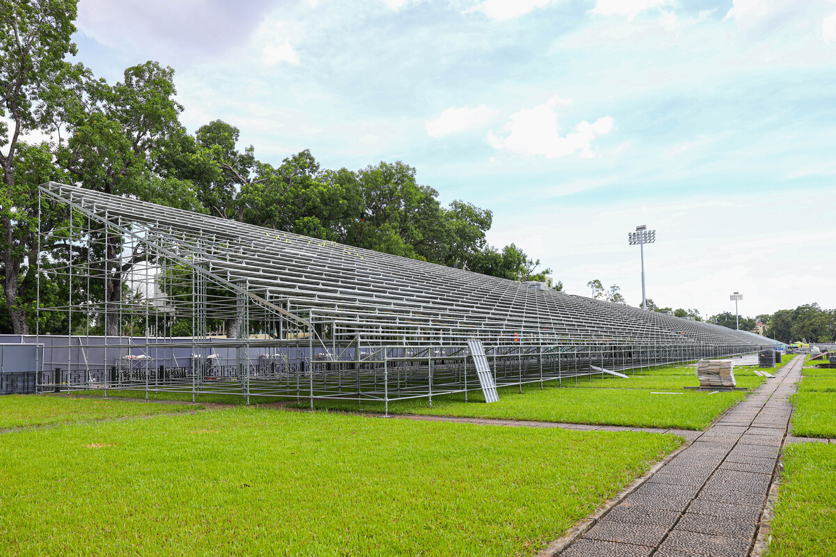 Các công nhân đang khẩn trương lắp ráp những băng ghế vào giàn giáo tại khán đài.