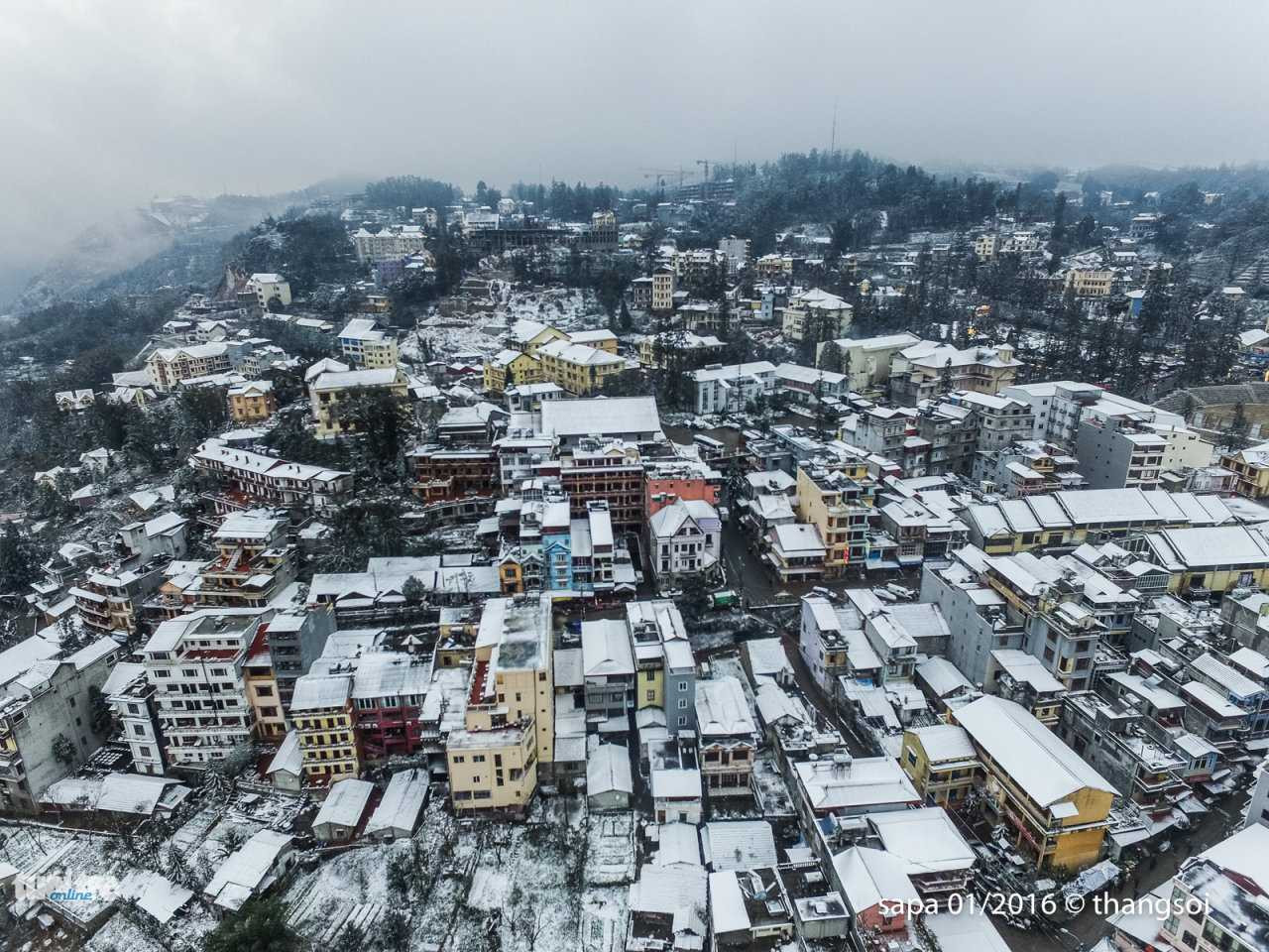 Nhìn từ cao, toàn bộ thị trấn Sa Pa và các bản làng xung quanh bị tuyết trắng phủ dày.