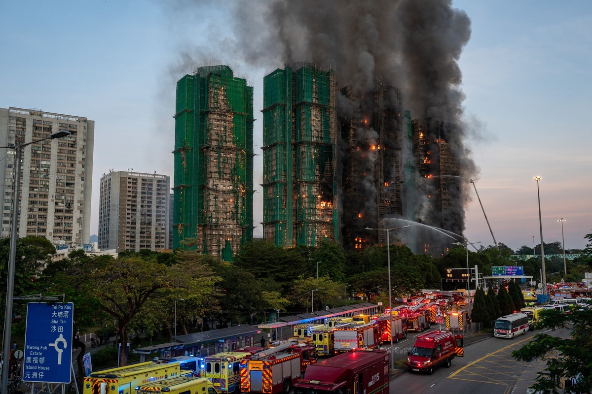 Giàn giáo tre, lưới bảo hộ che quanh toà nhà cùng các tấm xốp nhựa che kín cửa sổ được cho là nguyên nhân khiến đám cháy lan rộng trong nhiều giờ. (Ảnh: REUTERS)