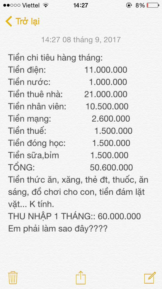 Facebook T.H.N: “Nhà tớ có tháng đỉnh điểm 98 triệu. Còn bình thường cũng 50-60 triệu không bỏ ra được ý. Chả biết tiêu gì. Cộng vào mà chán”.