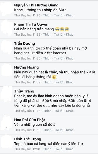 Facebook T.Q bình luận: “Nếu tiền điện hết 11 triệu 1 tháng thì quán nét đó hẳn rất đông khách. Máy chạy xuyên đêm không nghỉ. Vô lý ở chỗ thu nhập được có 60 triệu trong khi đông khách vây???”.