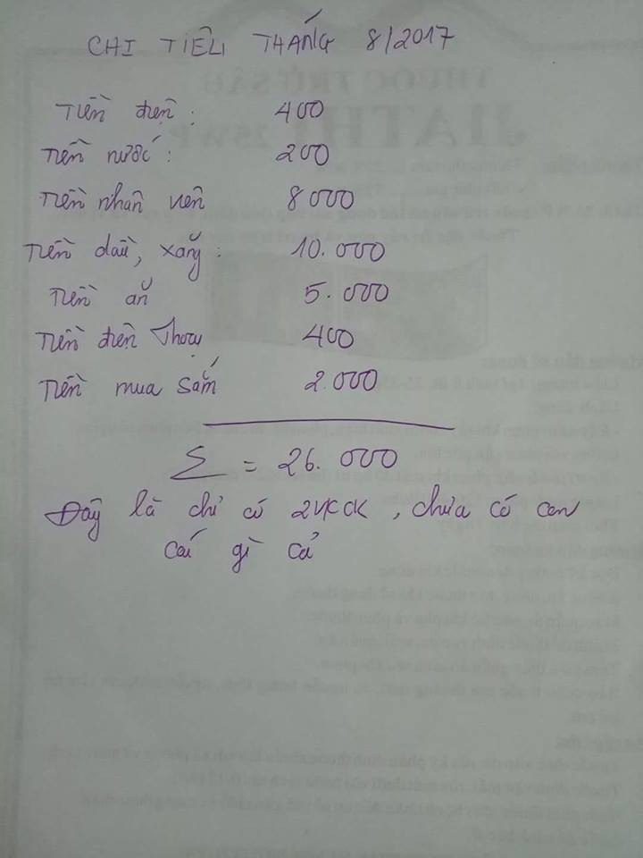 Tổng: 50,6 triệu (chưa tính tiền ăn, xăng xe, điện thoại, thuốc….)