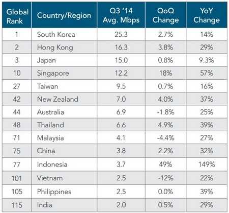 Về các quốc gia dẫn đầu thế giới trong tốc độ internet, châu Á có 4 đại diện, với sự dẫn đầu vẫn thuộc về Hàn Quốc (25,3Mbps), đáng ngạc nhiên nhất là Hồng Kông (16,3Mbps) đã vương lên xếp thứ 2, Nhật Bản (15,3Mbps) ngậm ngùi tụt xuống thứ 3 và quốc gia duy nhất của khu vực Đông Nam Á là Singapore (12,2Mbps) lọt vào top này với vị trí số 10.