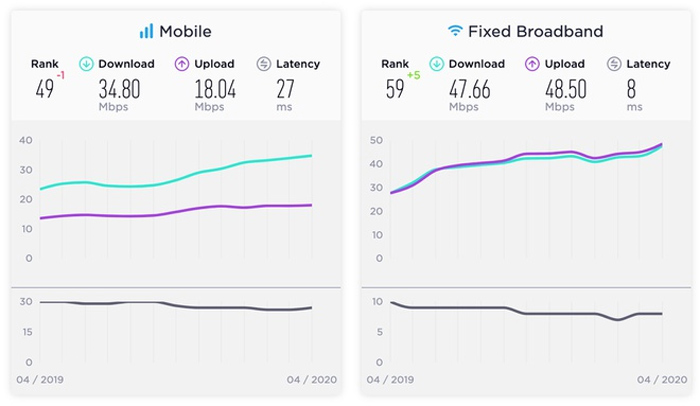 Trên thế giới, tốc độ Internet băng thông rộng của Việt Nam đứng thứ 59, tăng 5 hạng so với tháng 3 (tốc độ 44,95 Mbps). So với tháng 4/2019, thứ hạng của Việt Nam đã tăng 14 bậc, khi ấy tốc độ Internet chỉ đạt 27,63 Mbps.