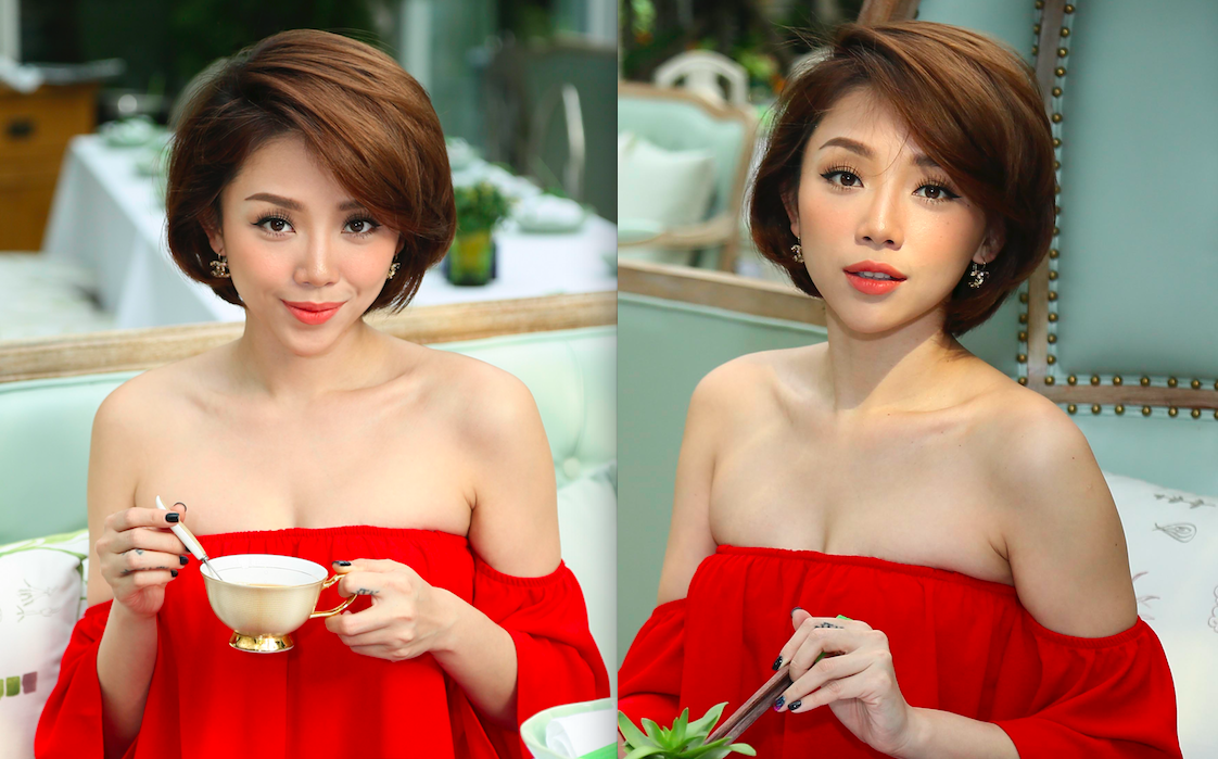 Xuất hiện tại nhà hàng chay của người bạn thân, Tóc Tiên diện bộ jumpsuit đỏ rực, trang điểm mộc mạc nhưng vẫn toát lên sự khỏe khoắn, tươi trẻ.