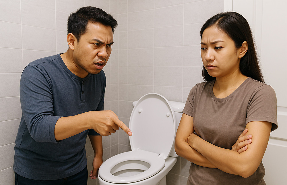Và rồi tôi á khẩu khi bị anh lên lớp một bài học về việc tiết kiệm nước, rằng lẽ ra khi xả tôi chỉ nên nhấn nút nhỏ trên bể chứa nước của bồn cầu. “Anh nghe tiếng là biết ngay em nhấn cùng lúc cả hai nước. Em không thấy là vô lý khi xả hết 6 lít nước à? Em là phụ nữ mà sống lãng phí như vậy, sau này quản lý gia đình kiểu gì?”.