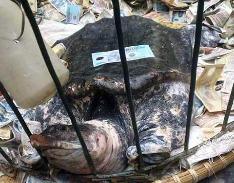 | Tội nghiệp "cụ" ba ba, nằm trong cũi, tiền rải khắp người . |