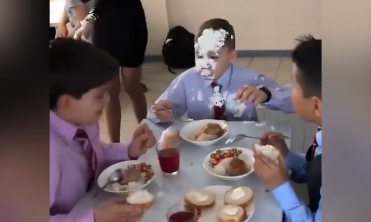 Vì trò đùa của một nhóm bạn không liên quan đến mình, cậu bé đang ngồi ăn bị chiếc bánh kem bay vào mặt.