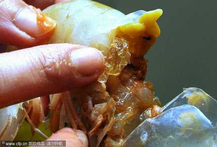 Một người dân tên Zhang cho biết cách đây vài ngày vợ chồng chị đã mua 2,5 kg tôm tại một chợ ở huyện Heping, chúng trông rất to và tươi, nhưng khi đem về nhà rửa thì chúng bị vỡ ra dễ dàng, và bên trong có cái gì đó giống như thạch vậy.