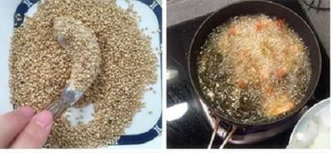 Nhúng tôm vào hỗn hợp vừa trộn ở bước 2 cho ướt rồi lăn qua một lớp vừng trắng áo ngoài.