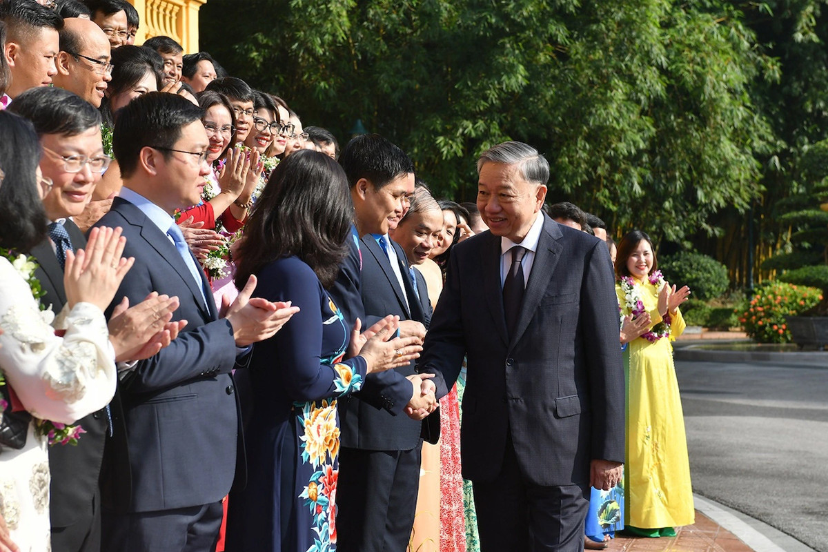 Tổng Bí thư, Chủ tịch nước Tô Lâm nhấn mạnh, các điển hình tiên tiến tại buổi gặp mặt hôm nay chính là những tấm gương tiêu biểu xuất sắc, tâm huyết, dám nghĩ, dám làm, dám chịu trách nhiệm, dám đổi mới sáng tạo, lao động đạt năng suất cao, chất lượng tốt; tận tụy, trách nhiệm cao trong công việc; hết lòng, hết sức vì nhiệm vụ chung, phụng sự Tổ quốc, phục vụ Nhân dân.