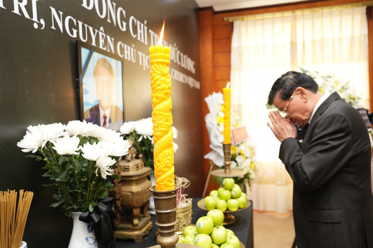 Đoàn đại biểu Đại sứ quán Việt Nam, các Cơ quan bên cạnh Đại sứ quán và cộng đồng người Việt Nam tại Lào lần lượt vào dâng hương, đặt vòng hoa và ghi sổ tang tưởng niệm nguyên Chủ tịch nước Trần Đức Lương trong sáng 24/5.