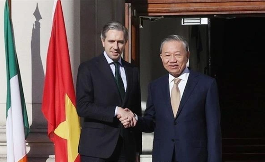 Tổng Bí thư, Chủ tịch nước Tô Lâm vui mừng thông báo với Thủ tướng Simon Harris việc Chính phủ Việt Nam đã quyết định và đang tiến hành các bước mở Đại sứ quán Việt Nam tại Ireland nhằm đóng góp tích cực vào sự phát triển của quan hệ hai nước.
