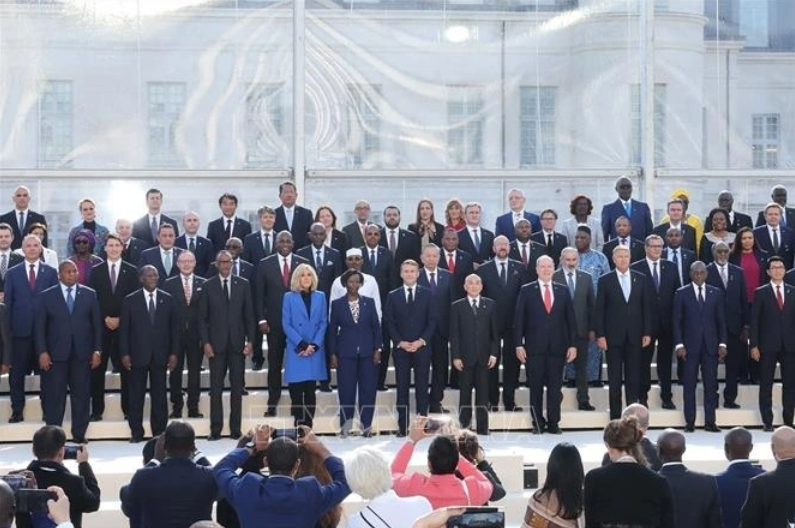Tổng Bí thư, Chủ tịch nước Tô Lâm, Tổng thống Cộng hòa Pháp Emmanuel Macron, Trưởng đoàn các nước thành viên Pháp ngữ và khách mời chụp ảnh chung. (Ảnh: Trí Dũng/TTXVN)