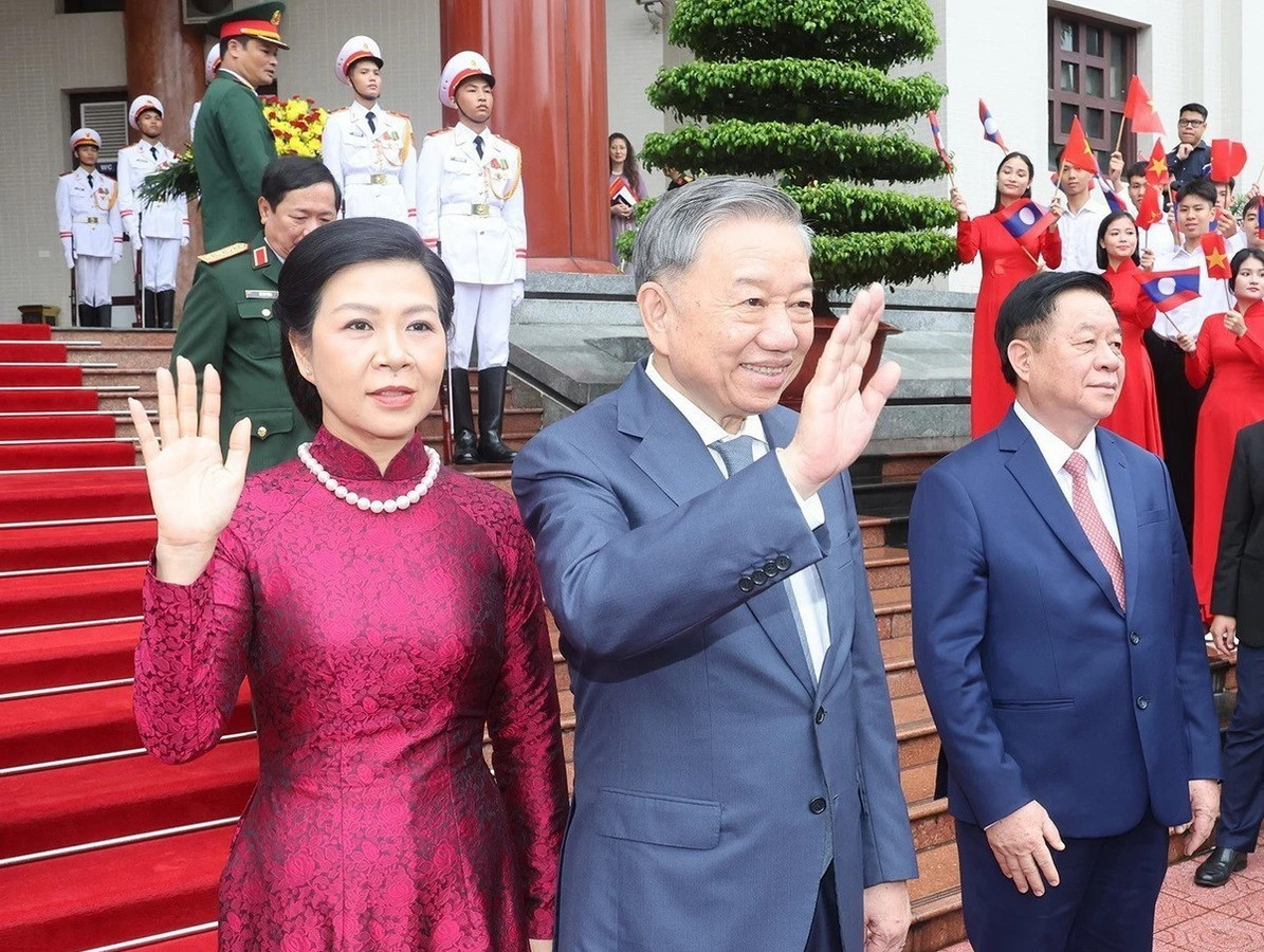 Tổng Bí thư, Chủ tịch nước Tô Lâm và Phu nhân tiễn Tổng Bí thư, Chủ tịch nước Lào Thongloun Sisoulith và Phu nhân. (Ảnh: Trí Dũng/TTXVN)