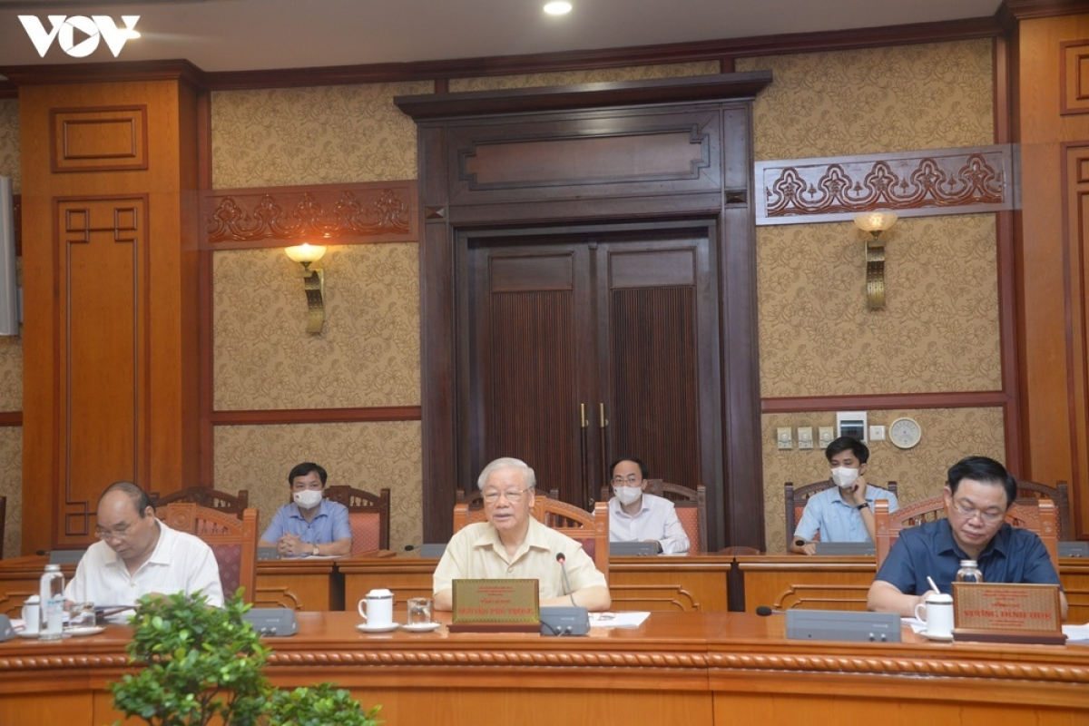 Phát biểu tại buổi làm việc, Tổng Bí thư Nguyễn Phú Trọng khẳng định, đây là cuộc họp cần thiết trong bối cảnh dịch bệnh diễn biến phức tạp như hiện nay. Nêu rõ dịch bệnh COVID-19 là vấn đề lớn của cả thế giới chứ không chỉ của nước ta và vô cùng phức tạp với nhiều biến chủng mới, Tổng bí thư biểu dương lực lượng tuyến đầu y tế, quân đội, công an, các Bộ ngành địa phương hay nói cách khác cả hệ thống chính trị đã nhanh chóng vào cuộc, với quyết tâm cao cố gắng trong vấn đề kiểm soát dịch bệnh, được đông đảo nhân dân đồng tỉnh ủng hộ.