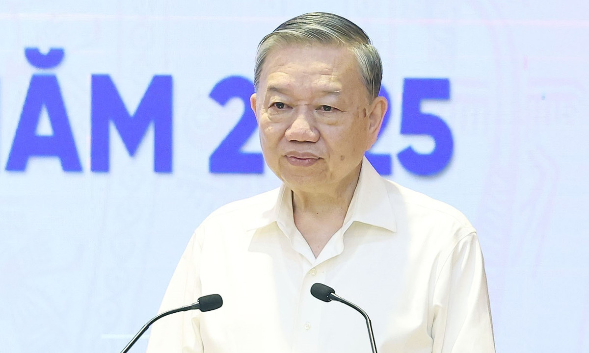 Tổng Bí thư Tô Lâm phát biểu kết luận Hội nghị sơ kết công tác 6 tháng đầu năm và nhiệm vụ trọng tâm 6 tháng cuối năm 2025 của Ban Chỉ đạo, diễn ra sáng 2/7. (Ảnh: TTXVN)