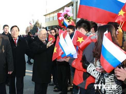 | Cán bộ, nhân viên Đại sứ quán và đại diện cộng đồng người Việt Nam tại Liên bang Nga đón Tổng Bí thư Nguyễn Phú Trọng tại sân bay Vnukovo 2 - Ảnh: TTXVN |