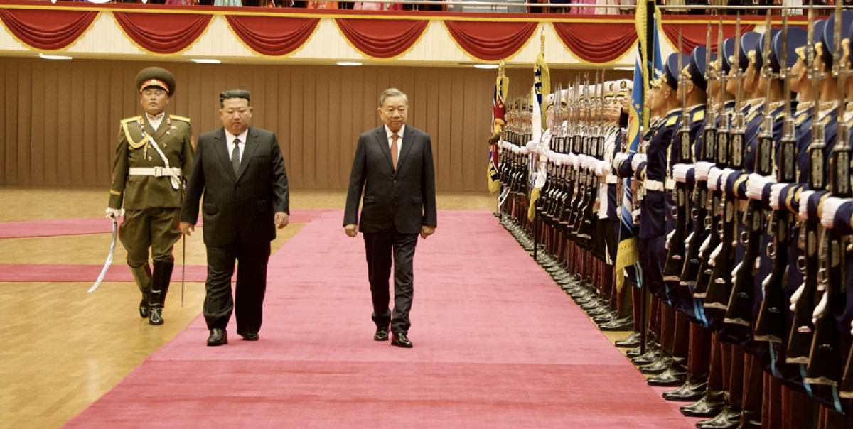 Tổng Bí thư Kim Jong-un và Tổng Bí thư Tô Lâm duyệt đội danh dự.
