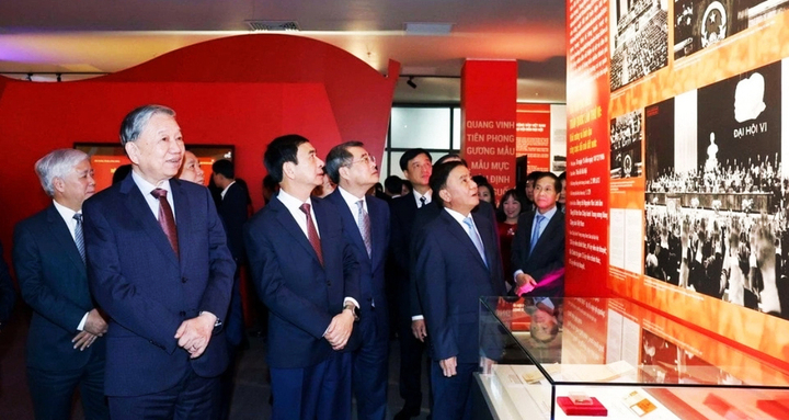 Tổng Bí thư Tô Lâm và các đồng chí lãnh đạo Đảng, Nhà nước tham quan triển lãm Đảng Cộng sản Việt Nam từ Đại hội đến Đại hội. (Ảnh: Thống Nhất/TTXVN)