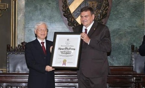 Hiệu trưởng Đại học Tổng hợp La Habana trao bằng Tiến sỹ danh dự ngành Khoa học Chính trị cho Tổng Bí thư Nguyễn Phú Trọng.