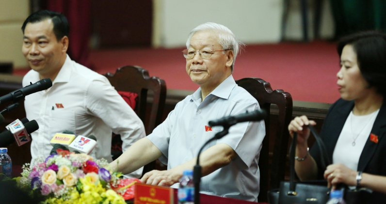 Tổng Bí thư Nguyễn Phú Trọng và các đại biểu Quốc hội Hà Nội tiếp xúc cử tri ở quậ Hà Đông. (Ảnh: Nam Nguyễn)