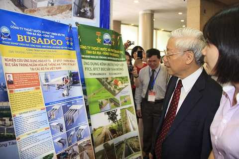 (VTC News) - Ngày 3/6, trong khuôn khổ triễn lãm chào mừng Đại hội đại biểu toàn quốc lần thứ 7 (2015-2020) của Liên hiệp các Hội Khoa học và Kỹ thuật Việt Nam (Vusta), gian trưng bày của Công ty Thoát nước và Phát triển đô thị tỉnh Bà Rịa-Vũng Tàu (Busadco) vinh dự được đón Tổng Bí thư Nguyễn Phú Trọng và nhiều lãnh đạo Đảng và Nhà nước tới thăm.