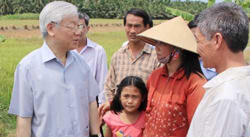 | Tổng bí thư thăm hỏi, chia sẻ khó khăn với người dân vùng bị thiên tai. Ảnh: Cửu Long |