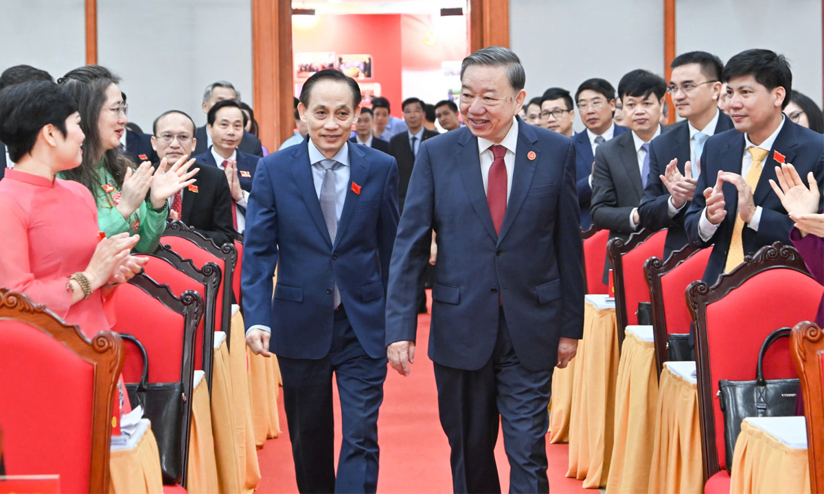 Tổng Bí thư Tô Lâm, nguyên Tổng Bí thư Nông Đức Mạnh, Thường trực Ban Bí thư Trần Cẩm Tú, nguyên Thường trực Ban Bí thư Trần Quốc Vượng, cùng các lãnh đạo và nguyên lãnh đạo Đảng dự Đại hội.