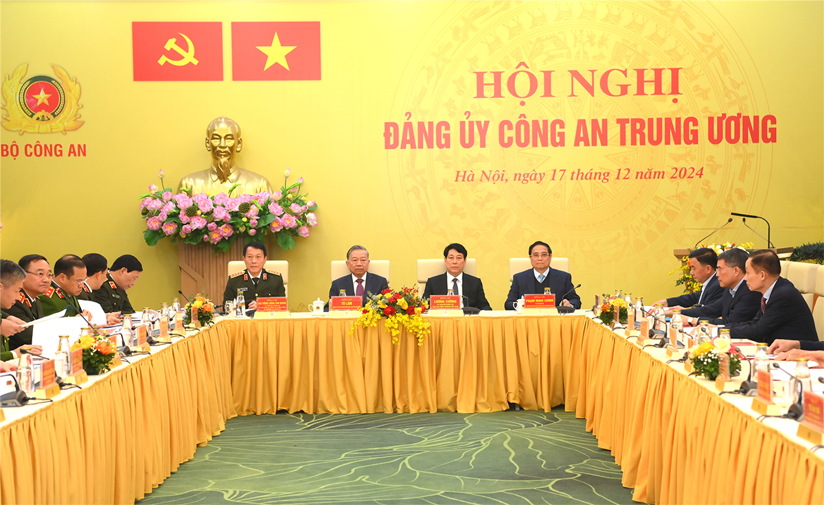 Tổng Bí thư Tô Lâm, Chủ tịch nước Lương Cường, Thủ tướng Phạm Minh Chính dự Hội nghị Đảng ủy Công an Trung ương năm 2024.