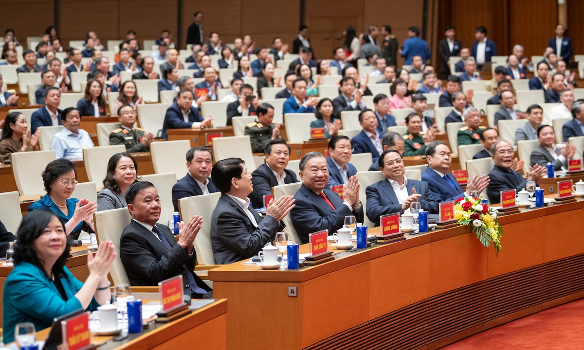 Tổng Bí thư Tô Lâm, Chủ tịch nước Lương Cường, Thủ tướng Phạm Minh Chính, Chủ tịch Quốc hội Trần Thanh Mẫn, nguyên Chủ tịch Quốc hội Nguyễn Sinh Hùng, Thường trực Ban Bí thư Trần Cẩm Tú cùng các lãnh đạo, nguyên lãnh đạo Đảng, Nhà nước dự tại Hội trường Diên Hồng.