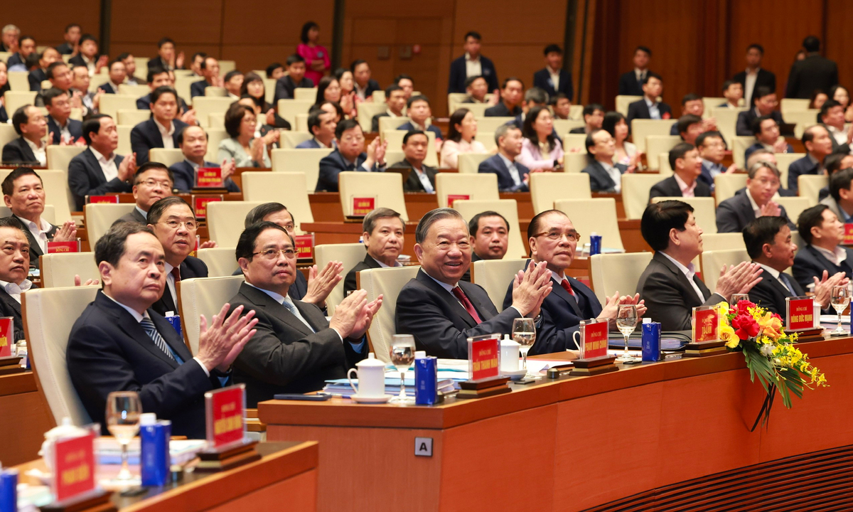 Tổng Bí thư Tô Lâm, nguyên Tổng Bí thư Nông Đức Mạnh, Chủ tịch nước Lương Cường, Thủ tướng Phạm Minh Chính, Chủ tịch Quốc hội Trần Thanh Mẫn, nguyên Chủ tịch Quốc hội Nguyễn Sinh Hùng, nguyên Chủ tịch Quốc hội Nguyễn Thị Kim Ngân, Thường trực Ban Bí thư Trần Cẩm Tú cùng các lãnh đạo, nguyên lãnh đạo Đảng, Nhà nước dự tại Hội trường Diên Hồng.