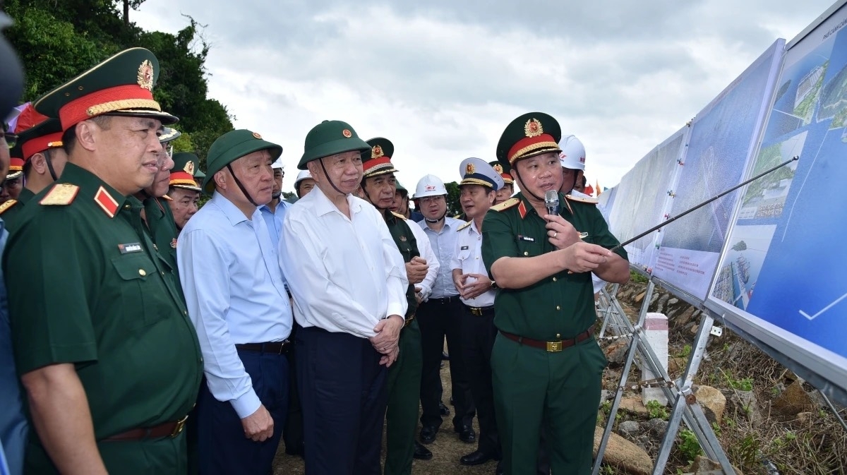 Tổng Bí thư Tô Lâm cùng đoàn công tác Trung ương cũng khảo sát tiến độ 2 dự án đường giao thông ra đảo và cảng tổng hợp lưỡng dụng tại cụm đảo Hòn Khoai.
