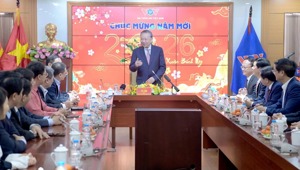 Tổng Bí thư Tô Lâm chia sẻ: "Trong thời khắc thiêng liêng chuẩn bị đón Tết Nguyên đán, mỗi một gia đình đang sum vầy, trên dọc các tuyến đường rực rỡ sắc xuân, tôi xúc động đến thăm, động viên cán bộ, công nhân viên, các kỹ thuật viên, phát thanh viên, người lao động Đài Tiếng nói Việt Nam cùng chia sẻ với các đồng chí, những người đang canh trời giữ sóng, giữ nhịp thông tin cho đất nước, cho quốc gia, kịp thời đến với từng người dân, từng địa bàn từng khu vực, không chỗ nào không có tiếng nói Việt Nam”.