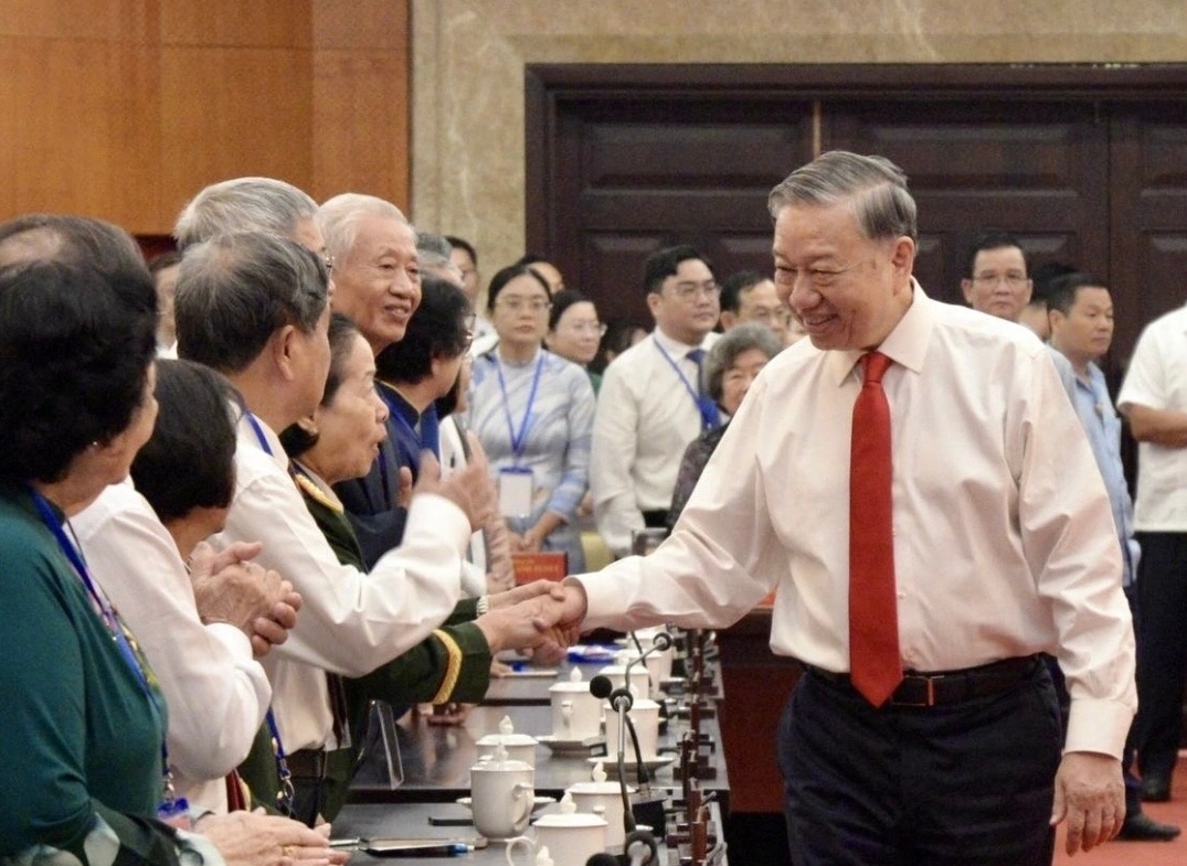Thay mặt lãnh đạo Đảng, Nhà nước, thân ái gửi tới các lãnh đạo, nguyên lãnh đạo, lão thành cách mạng, các Mẹ Việt Nam Anh hùng, Anh hùng Lực lượng vũ trang, Anh hùng Lao động, các gia đình chính sách, cùng toàn thể đồng bào, đồng chí TP.HCM lời thăm hỏi ân cần và lời chúc mừng năm mới tốt đẹp nhất, Tổng Bí thư Tô Lâm đánh giá cao những nỗ lực, cố gắng và kết quả mà Đảng bộ, chính quyền và Nhân dân thành phố đã đạt được trong thời gian qua.