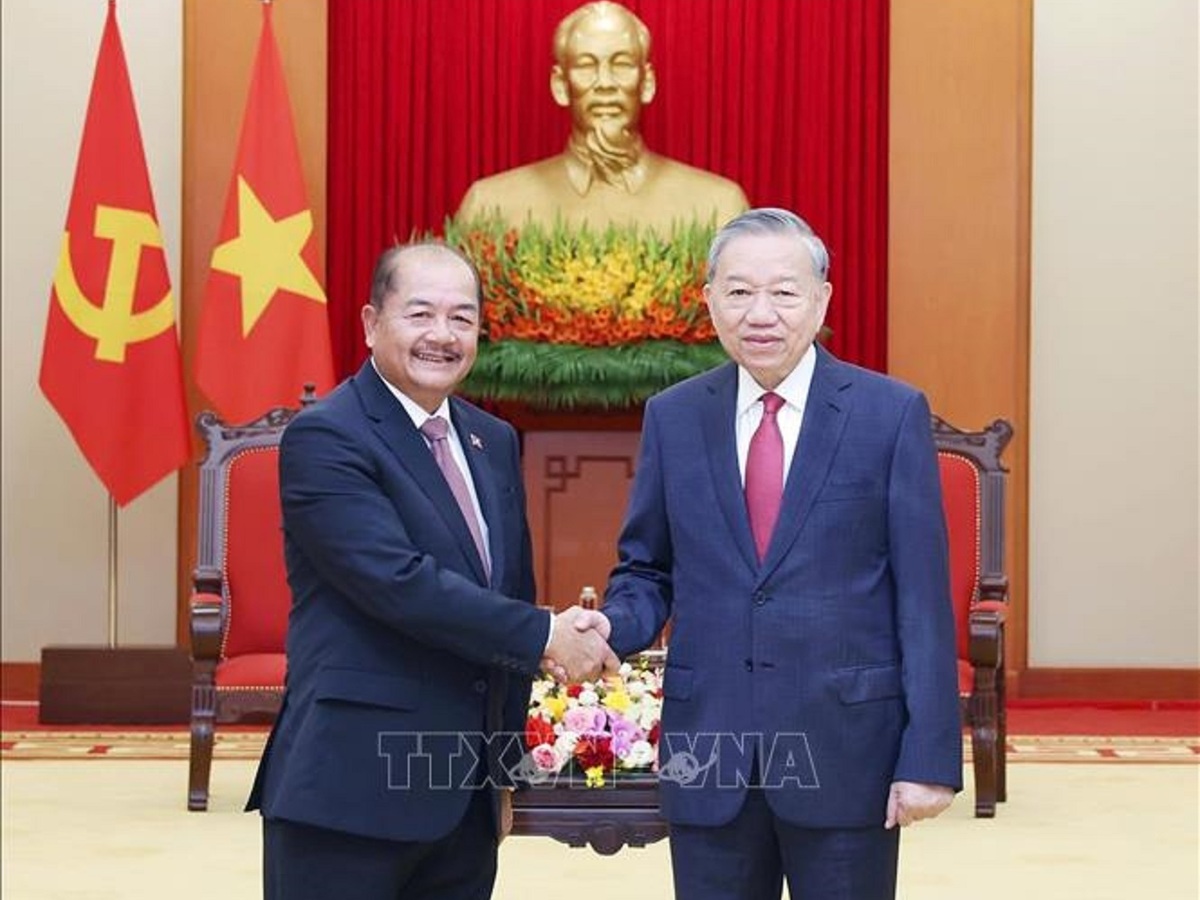 Tổng Bí thư Tô Lâm tiếp Phó Thủ tướng Lào Kikeo Khaykhamphithoune. (Ảnh: TTXVN)