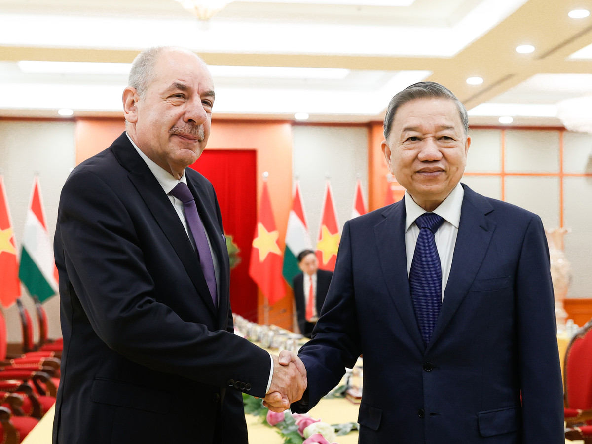 Tổng Bí thư Tô Lâm và Tổng thống Hungary Sulyok Tamas chụp ảnh chung.