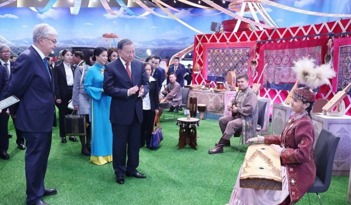 Tổng Bí thư Tô Lâm và Phu nhân cùng Tổng thống Kassym-Jomart Tokayev tham quan Làng Văn hóa Dân tộc Kazakhstan. (Ảnh: Thống Nhất/TTXVN)