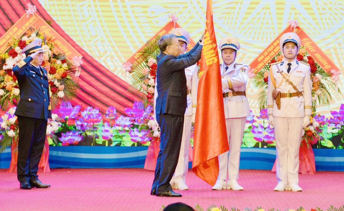 Tổng Bí thư Tô Lâm gắn Huy hiệu danh hiệu AHLLVTND lên quân kỳ quyết thắng
